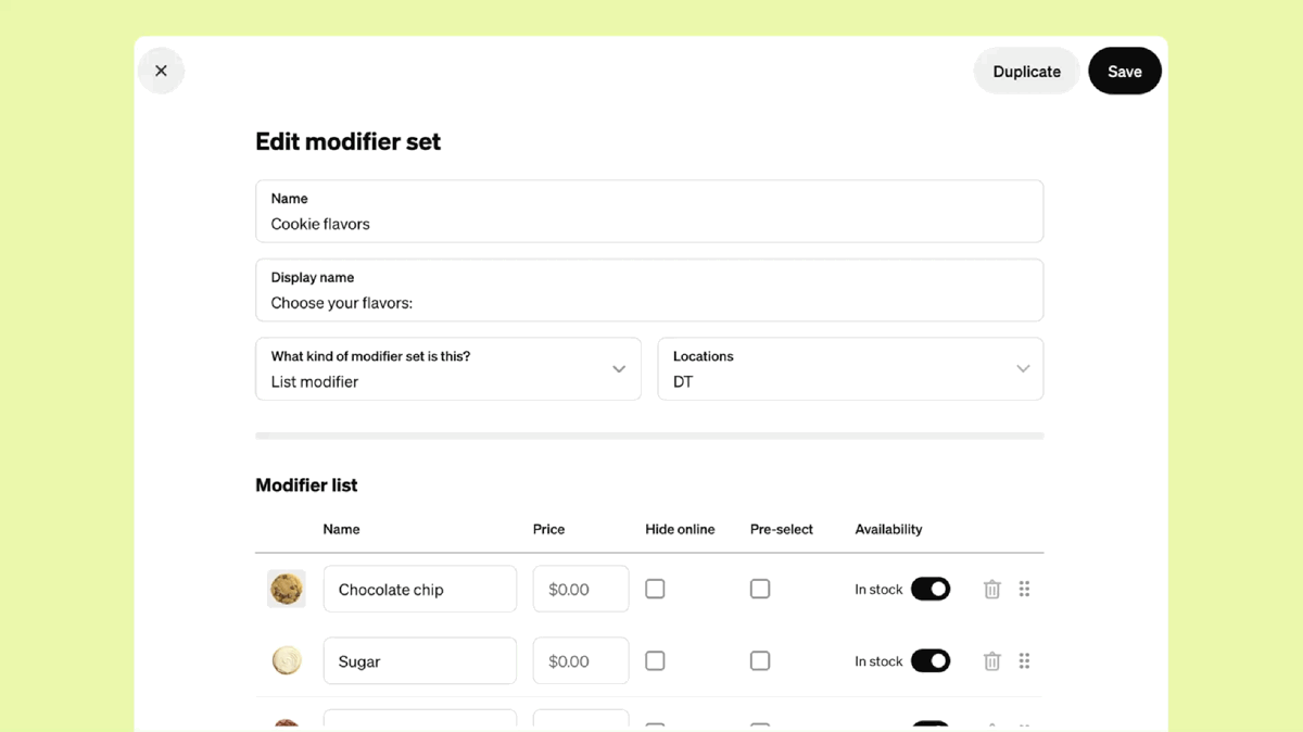 Restaurants with complex menus were either going without, or building messy workarounds. On a competitor’s platform, building a box of a dozen donuts only required one modifier set. On Square, it took twelve. And every time you updated your flavors, you had to update every. single. one.
