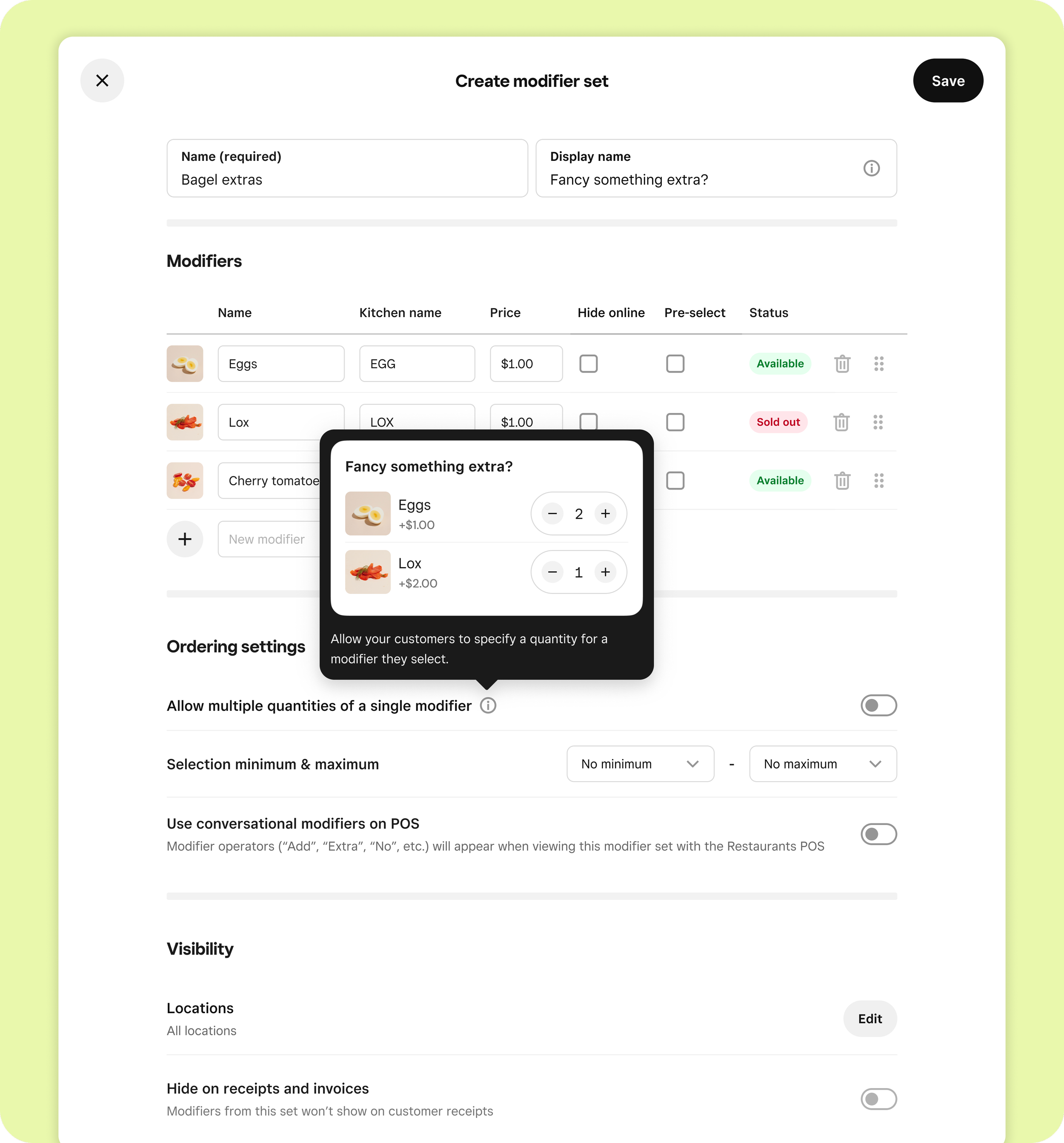 Shipped modifier quantity ordering UI on the Square Point of Sale and Square Websites